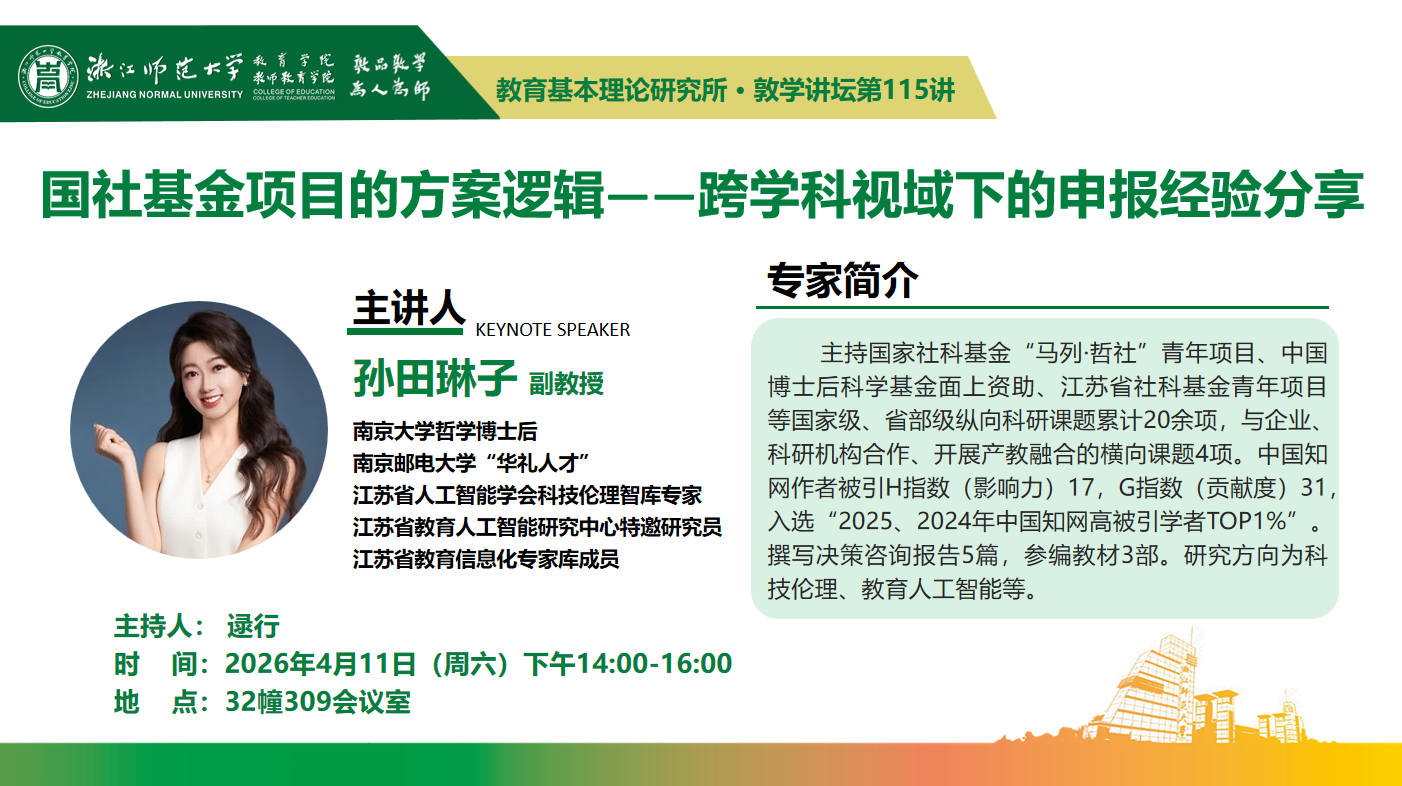 【讲座预告】孙田琳子副教授主讲敦学讲坛第115讲:《国社基金项目的方案逻辑——跨学科视域下的申报...