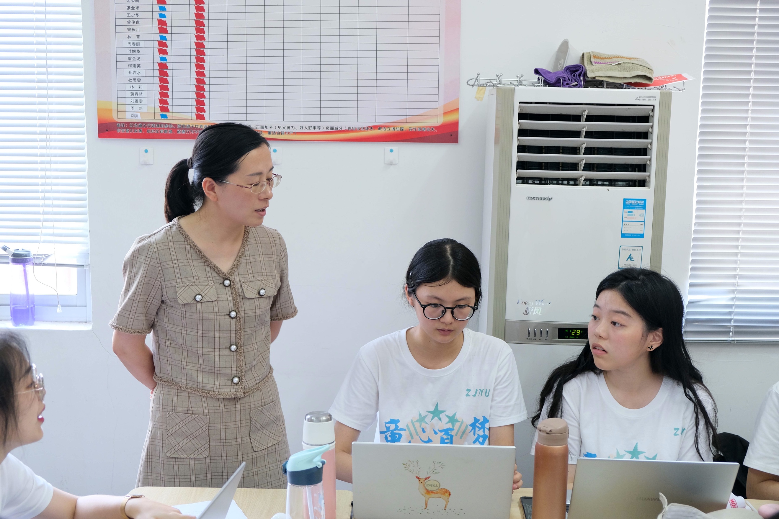 会议结束后,叶老师来到了办公室和后勤厨房,了解和指导同学们在课堂背后的各项工作。此时,办公室里的同学们正在电脑前进行着紧张的备课、外宣、调研、活动策划等工作,厨房里的同学们则展示起了娴熟的切菜技能。