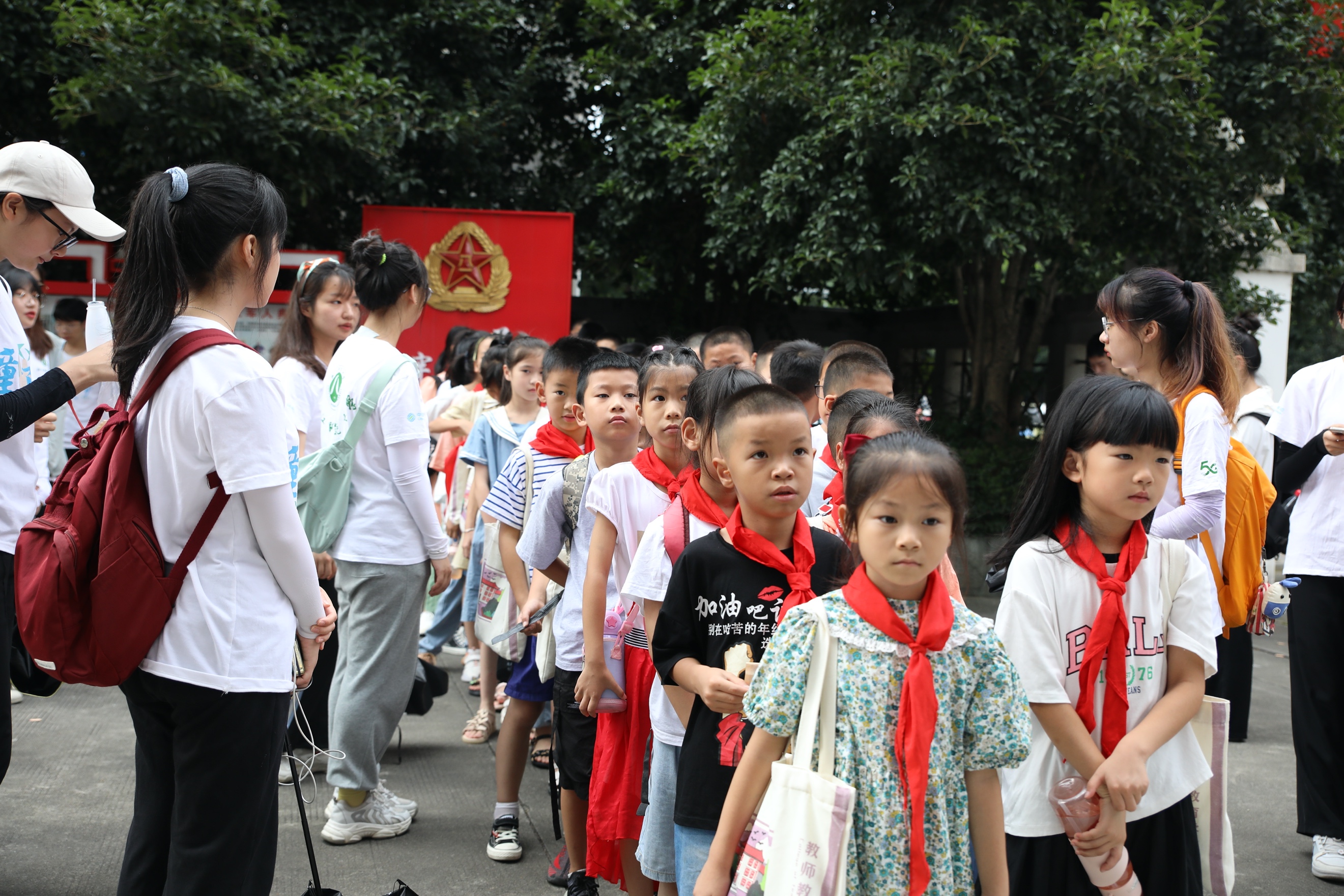 清早的徐徐凉风一扫往日燥热,明媚阳光的沐浴变得柔和。上午八点半,小朋友们在实践队队员们的组织下有序地排起了队伍,走进龙泉退役军人事务局活动中心参观。