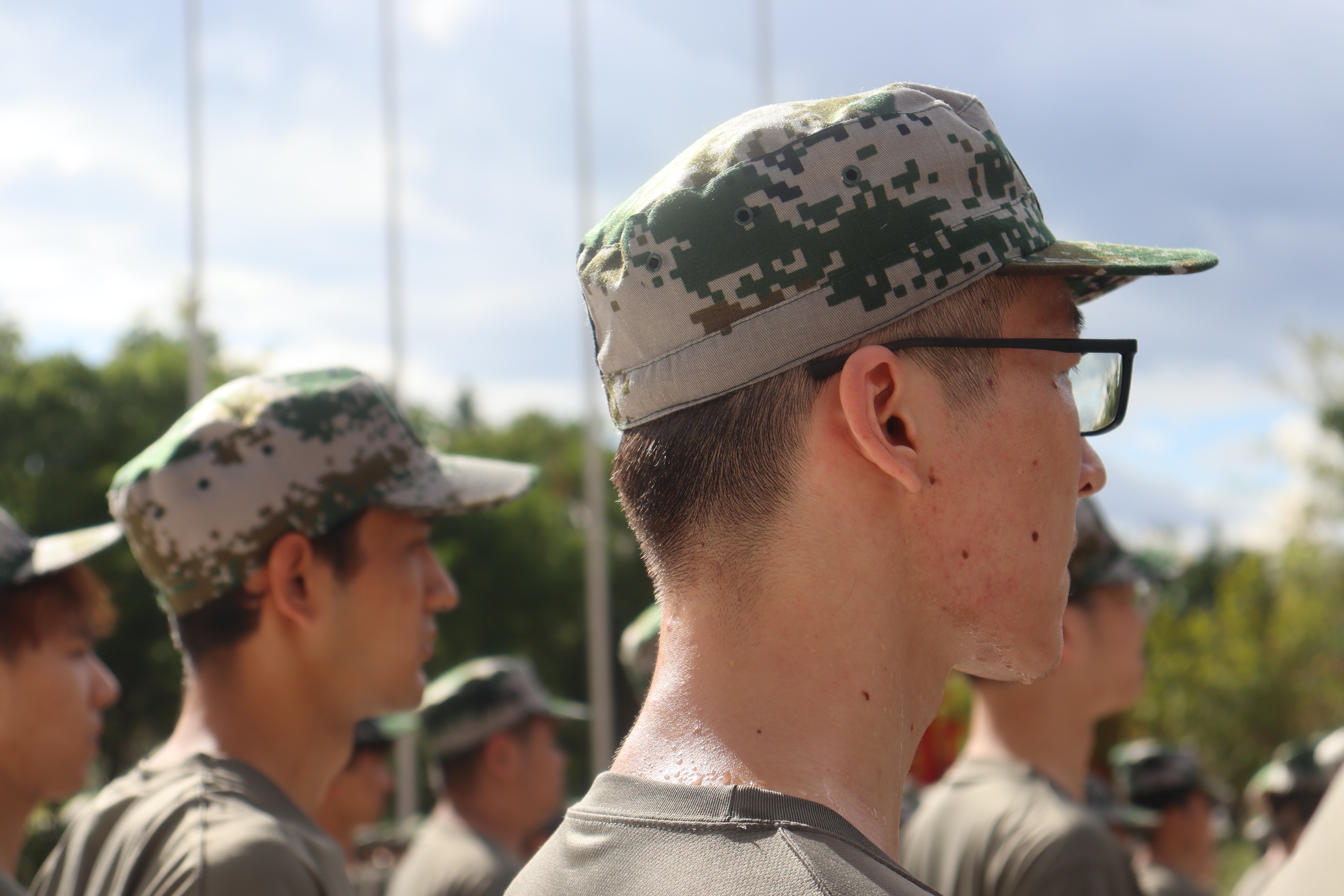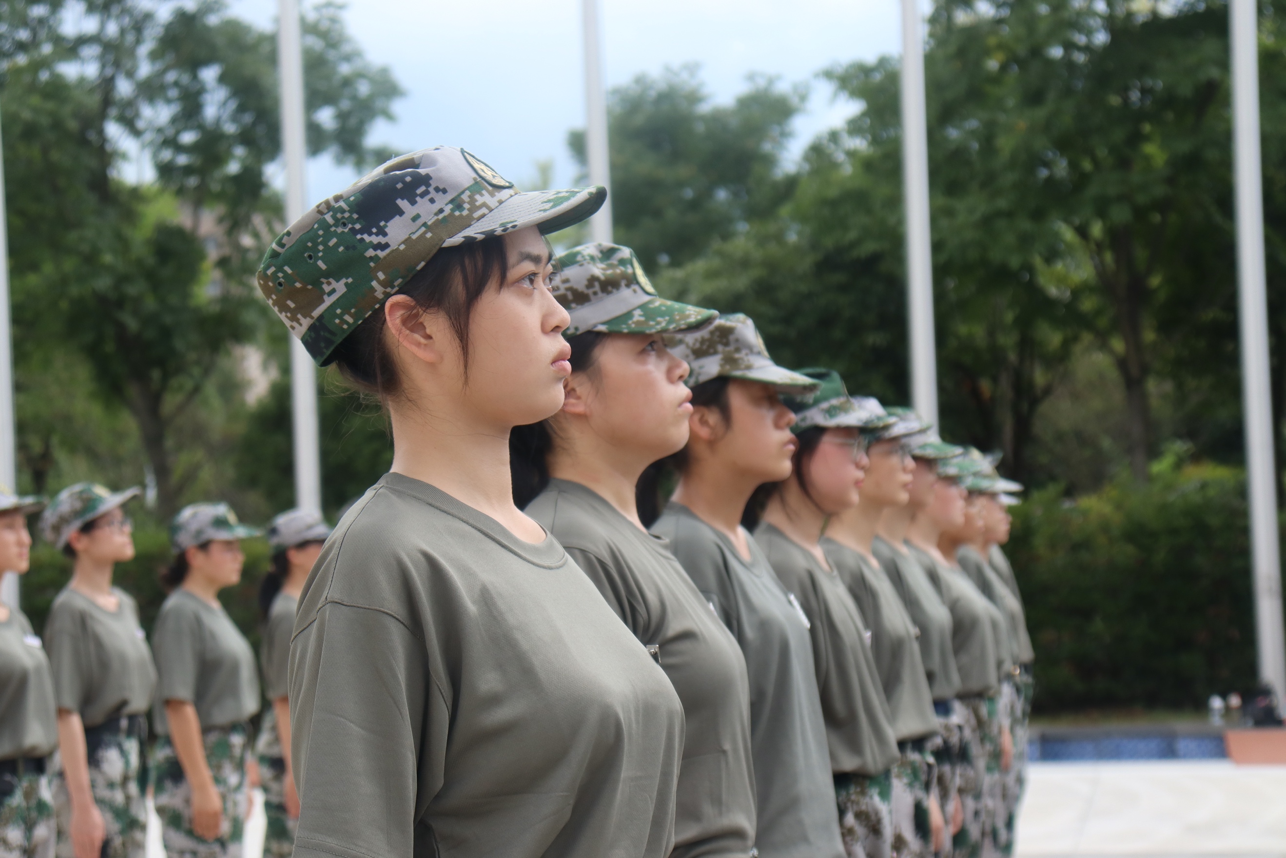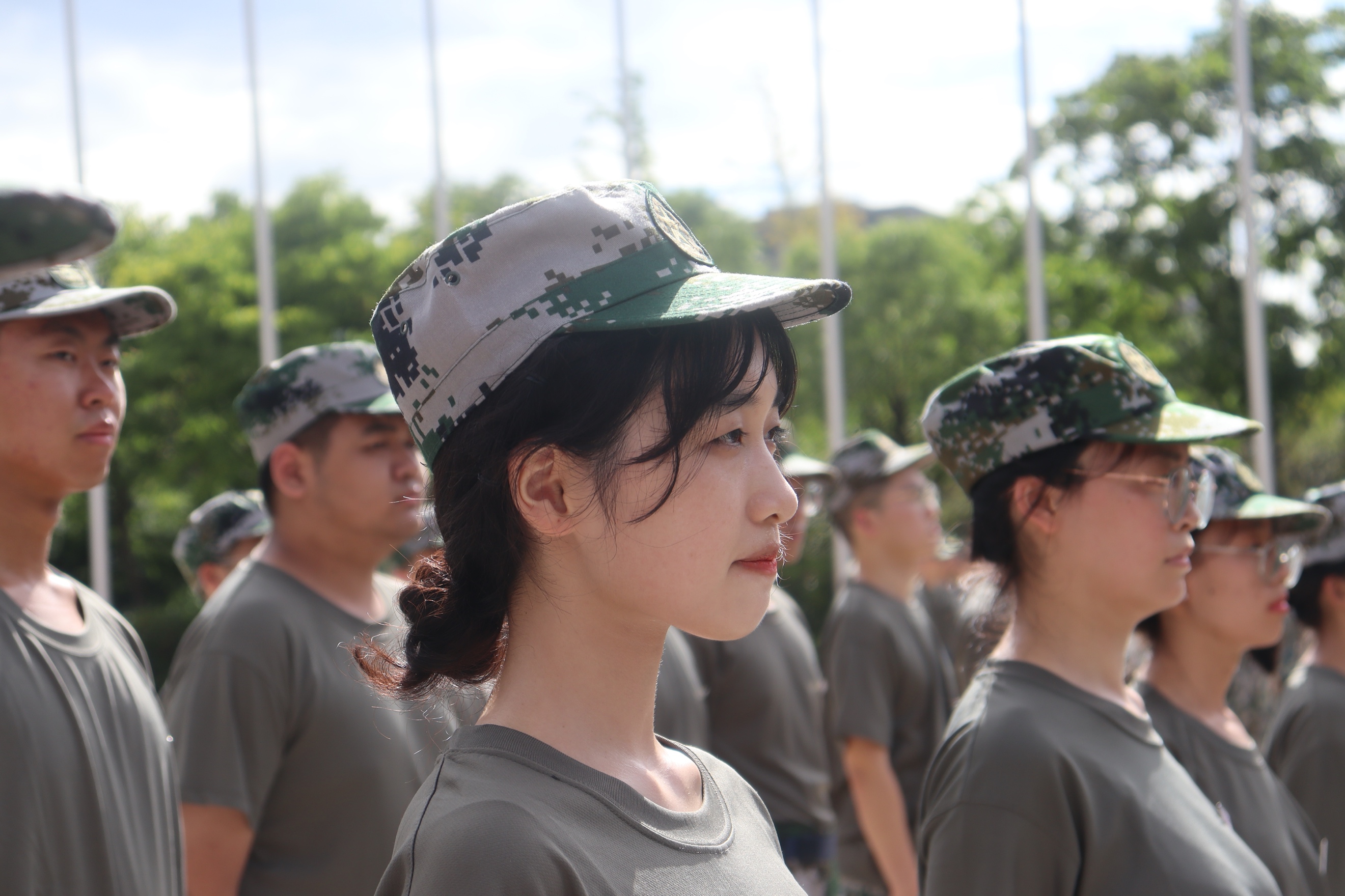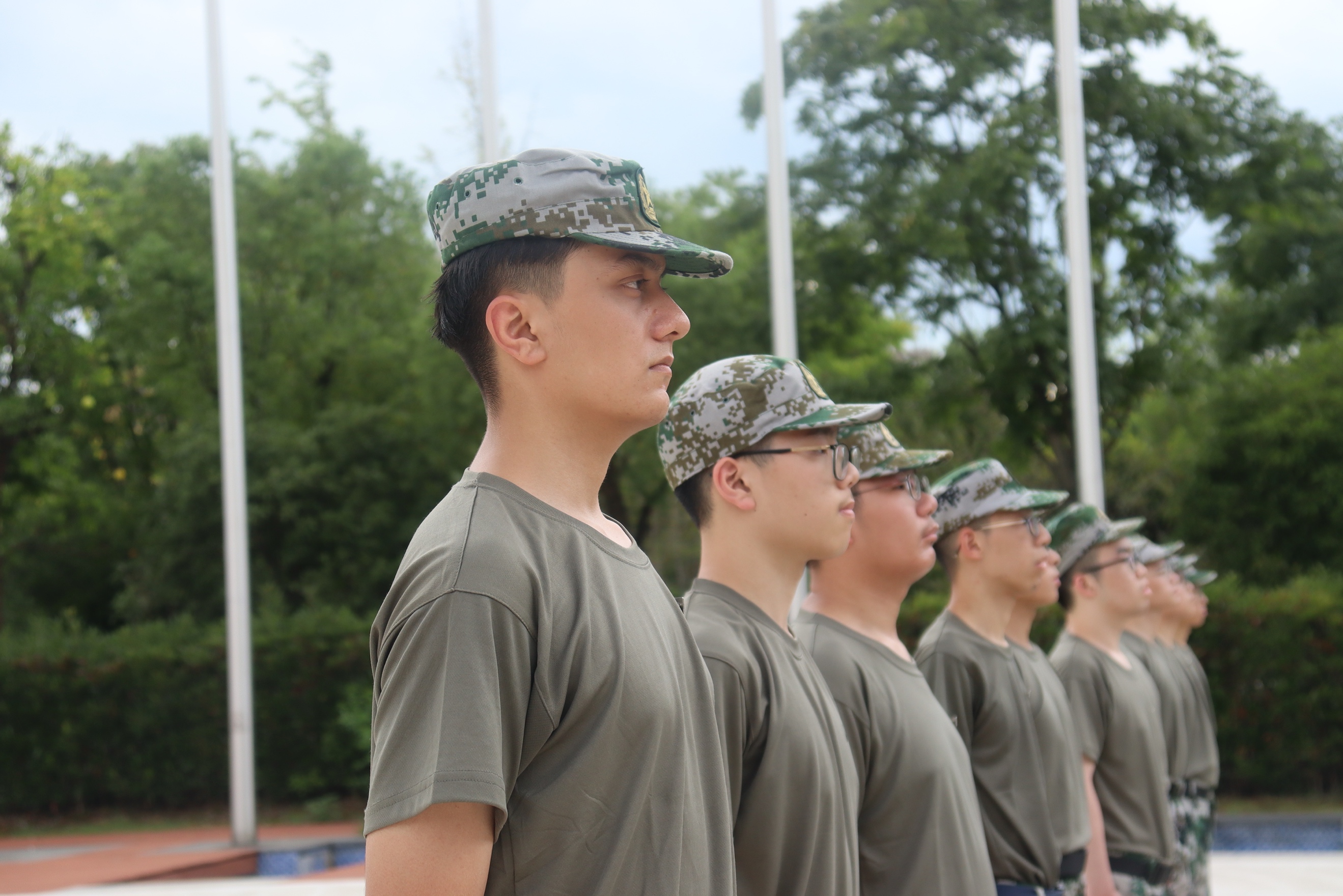 站军姿是新生们训练队列动作的第一节必修课。在教官的指导下,他们努力把脊梁挺得笔直,双手贴紧身体两侧,收腹、挺胸、抬头,平视前方的目光从容坚定,毫不懈怠。