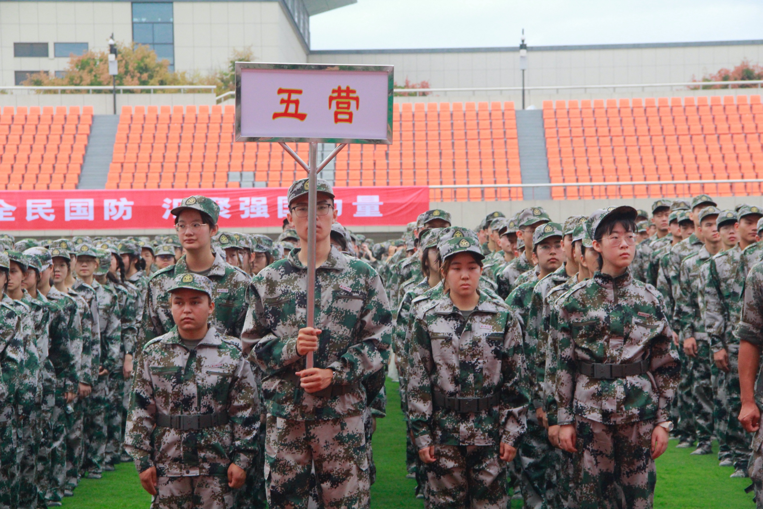 军训首日,天公作美,习习凉风驱散了蒸腾的暑气,蔽日的云空下,排列整齐的教院方阵更突显了一份“乱云飞渡仍从容”的不折气度。在上午的新生军训动员大会结束后,同学们迈开整齐的步伐来到了文化广场。“教育精英,不忘初心,铿锵五营,壮志凌云”的横幅已经展开,等待着同学们在这里接受国防教育,于艰苦的军训拉练中培养优良作风。