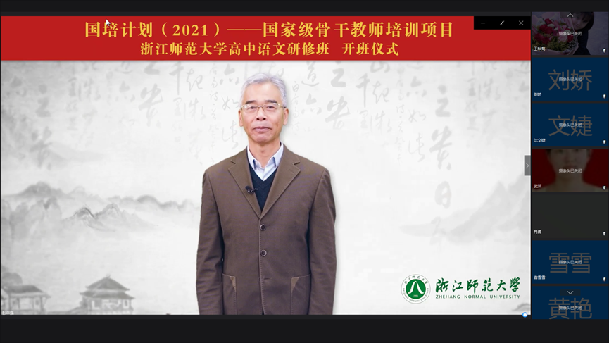 2021年12月15日上午,教育部国培计划(2021)——示范性集中培训项目浙江师范大学高中语文培训班开班典礼通过钉钉会议隆重举行,来自全国各地的40名高中语文骨干教师怀着激动的心情相聚云端。这是因疫情反复而经历了两次改期后,经项目组精心设计,校院多部门合作而成功举办的活动。