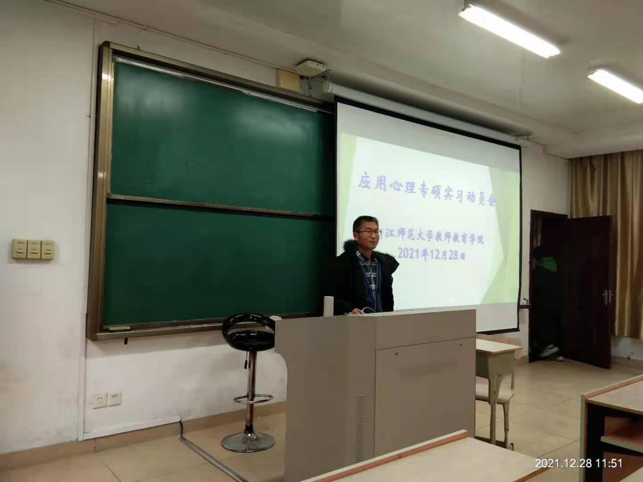 为更好地营造应用心理专业学位研究生重视实践实习的氛围以及强化应用心理专硕实习实践规范管理,促进学生认识实习的意义和熟悉实习的章程,应用心理专硕学位点于2021年12月28日上午在5幢101召开2020级应用心理专硕实习动员会。教师教育学院副院长钱旭升老师、研究生办主任刘冬仙老师、学位点负责人陈海德老师以及2020级应用心理全体专硕同学出席动员会。
