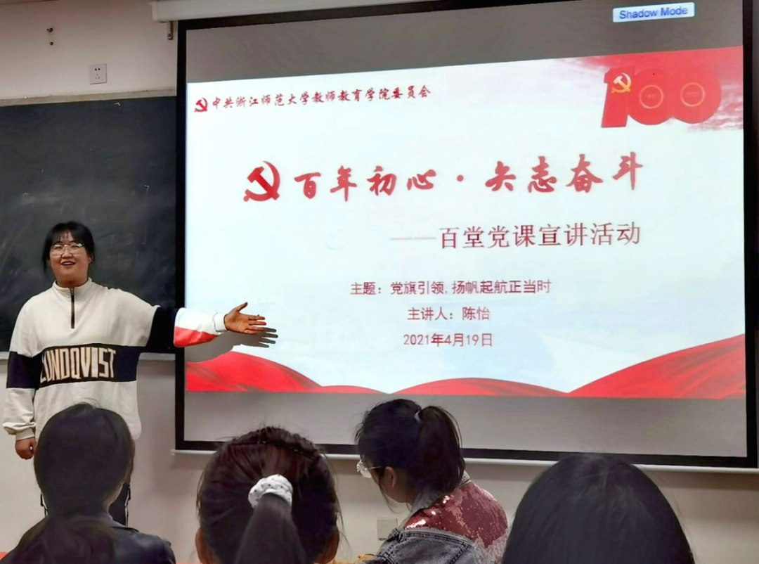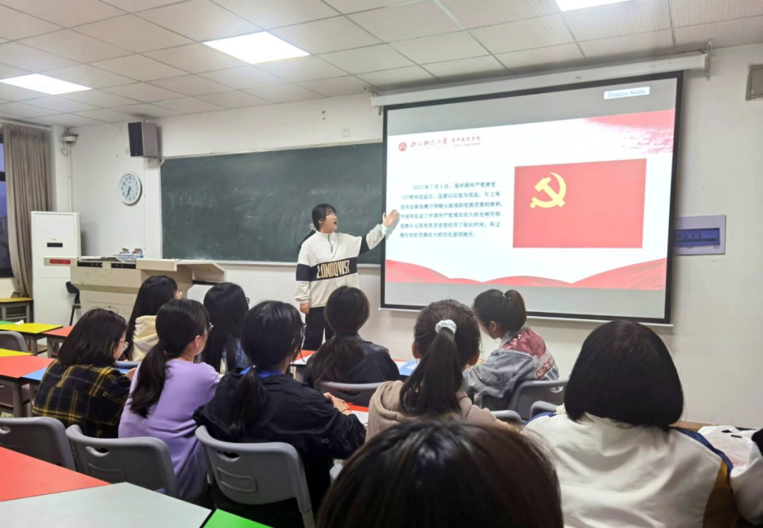 4月19日,教育技术学本科生党支部在16幢312教室召开了百日党课宣讲活动,学生党员陈怡以“党旗引领,扬帆起航正当时”为主题,为支部成员带来了一堂别开生面的党课。