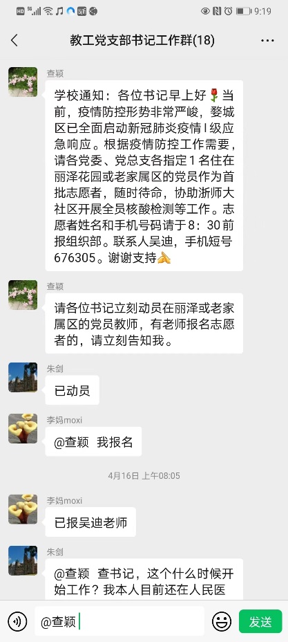 疫情就是命令,防控就是责任。浙江师范大学紧急启动应急措施,在全校范围内招募党员教师,作为浙师大社区全员核酸检测的首批志愿者。凌晨5点,教师教育学院教工党支部书记工作群便发出了招募通知,教育技术学系教师党支部书记李鸣华老师第一个报名参加。