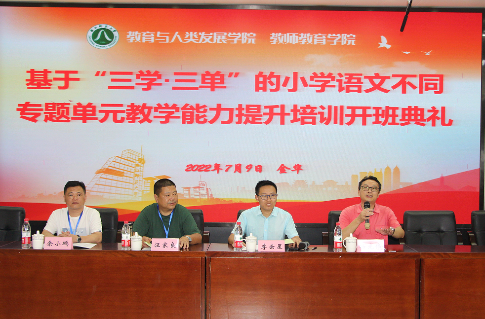 7月9日下午一点,浙江师范大学教师教育学院举办了基于“三学·三单”的小学语文不同专题单元教学能力提升培训的开班典礼,kaiyun开云官方网页版院长助理李云星、衢州市开化县研训中心副主任汪家良参加开班典礼并讲话,开班典礼由教师教育学院社会服务中心主任杨光伟主持。此次,开化县117名小学语文骨干教师参加培训。
