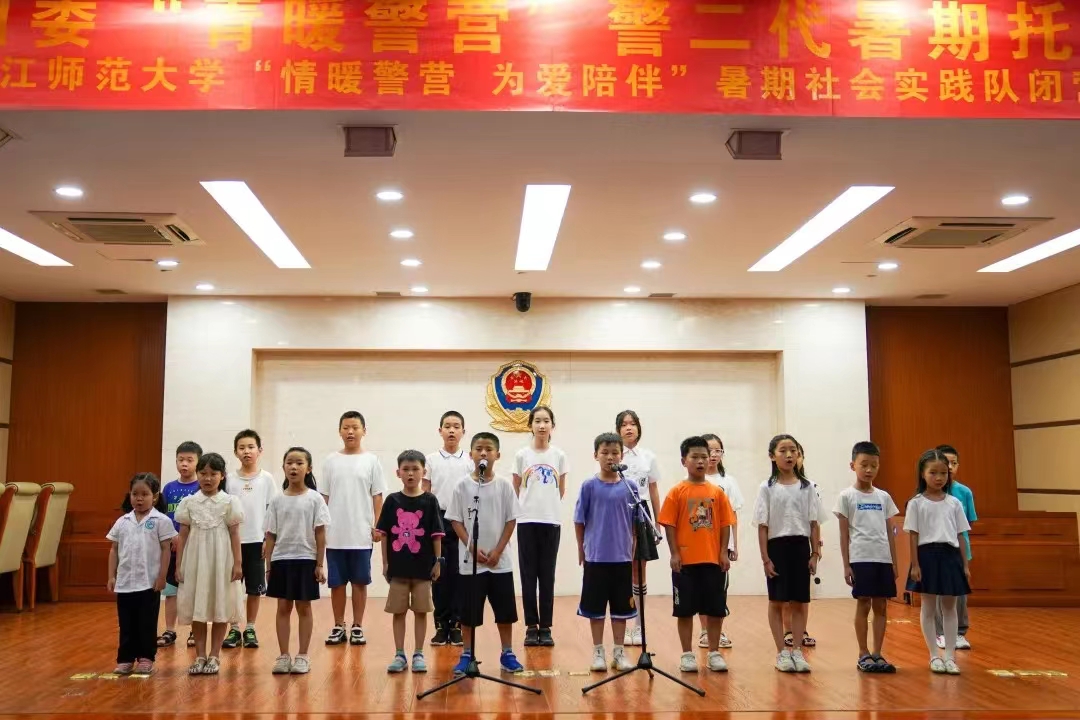 7月15日,夏令营活动接近尾声,金华市公安局团委“青暖警营”警二代暑期托管班汇报演出暨浙江师范大学“情暖警营,为爱陪伴”暑期社会实践队闭营仪式在金华市公安局报告厅隆重举行。实践队员与小朋友们认真排练,为一线人民警察带来了一场精彩演出,现场气氛热烈,笑语不断。小教213班张磊同学与实践队员一起向观众交出《一张考卷》,家长与孩子沉浸于表演,在欢乐小品《一张考卷》中体会家庭的和谐温暖。