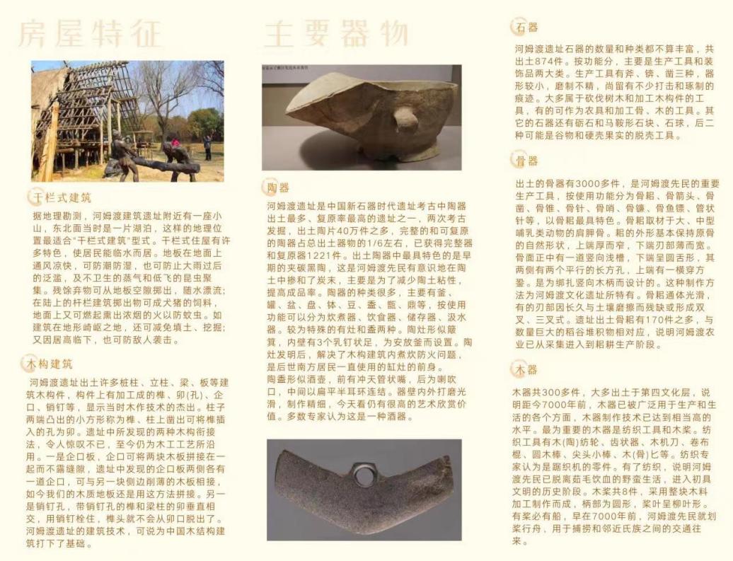 在问卷调研后,实践队成员前往了河姆渡遗址博物馆进行实地考察。通过观察考古出土的金枪鱼脊椎骨、带切割痕迹的鹿角,队员们仿佛看到了在几千年前的丘陵山地上,大象、犀牛等大型哺乳动物出没其间;看着河姆渡原始人民用箭射鱼,用骨耜开垦成片的水稻田,也体会到了原始社会的人们自给自足、用劳动创造未来的快乐。研究河姆渡原始居民居住的干栏式建筑和于垂直点使用的榫卯结构,队员们不禁感叹于他们的智慧,想象着他们穿针缝衣、舟楫穿梭、饭稻羹鱼的定居生活。经过几日的实地考察,大家对河姆渡文化有了更深入的了解,也对在余姚地区将河姆渡文化融入劳动教育更增添了一份信心。