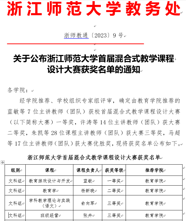 日前,学校公布了首届混合式教学课程设计大赛的获奖名单,《教育游戏设计与开发》获一等奖并推荐参加省赛,《教育学》获二等奖,《学科教学理论与实践(语文)》和《班级经营》获三等奖。