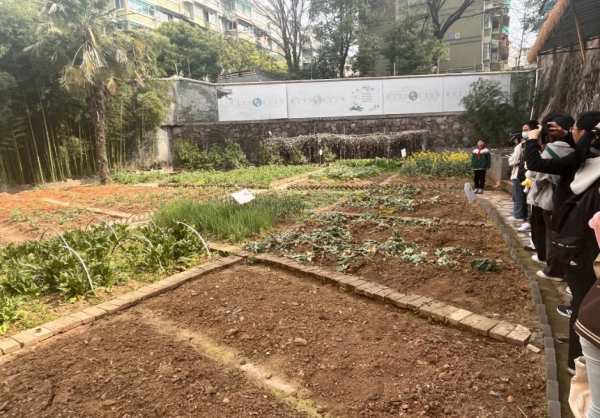 追随着讲解员的步伐,同学们还参观了站前小学的生态教育实践园。学校将这块空地开辟出来,种上了各类蔬果,并贴心地为每种植物挂上了小牌子。学生们在这里体验劳动的乐趣,了解劳动的价值。