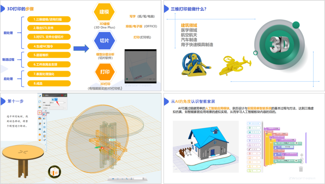 本次科创技能提升活动分为基础知识讲解和实操案例分享两大部分。中望软件资深技术工程师黄立、陈梓研,从三维创意设计与3D打印的发展演变与意义、激光切割的原理与实施、生活与人工智能三大维度,向学生们讲解三维数字建模及相关技术在教育教学中的发展和应用,并基于中望3D One三维创意设计软件、中望3D One Cut激光切割三维设计软件、中望3D One AI人工智能三维仿真软件,向参训学生展示三维设计在不同领域以及跨学科中的实际应用案例,帮助学生理解以中小学科技创新教育为场景的科创教学实施过程。