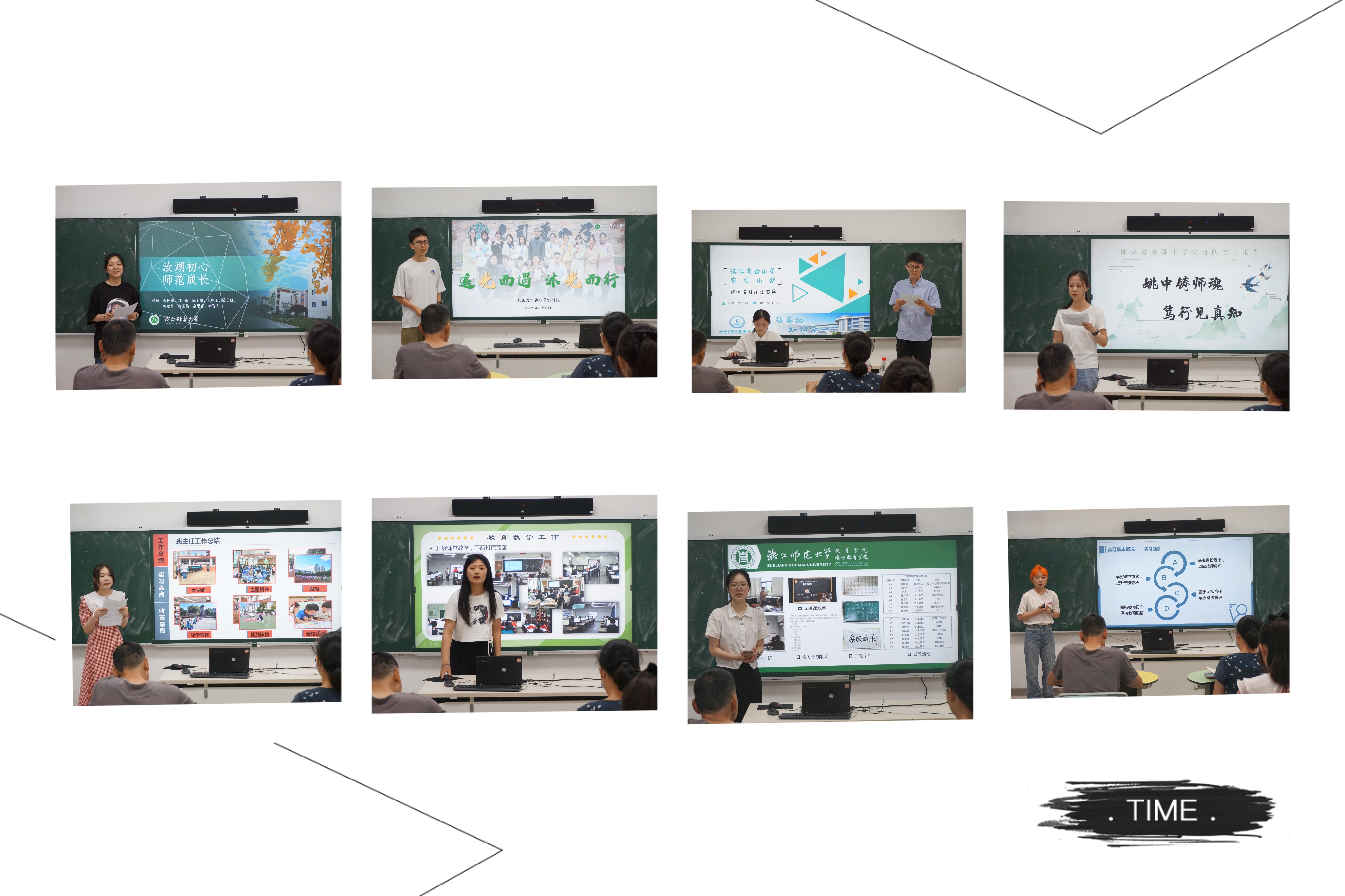 “追光而遇,沐光而行”,永康大司巷小学实习队从教学工作、班主任工作、教研工作、个人和集体成长四个方面全面展示了本次实习的成果。浙江师范大学附属丁蕙实验小学实习队以“‘蕙’聚星光,共赴未来”为主题,从教学实践、班级管理、教育科研、校园活动四个维度对实习情况进行了系统汇报。浙江师范大学附属泗门实验中学实习队围绕“汝湖初心,师范成长”的主题,以四个“说”对实习收获进行汇报:一说学校和团队,二说教学和教研,三说日常和跟岗,四说成果与收获,生动地展现了他们丰富多彩的实习生活。杭州金山小学实习队从教学、班主任工作、教研活动等方面对实习工作进行了总结,实习期间,他们还采用“互联网+”群直播的形式实现同传交互,并通过专题培训、写实习日记和实习简报,进行反思和感悟。“姚中铸师魂,笃行见真知”,余姚中学实习队从学科教学、班级管理、教学调研和创新实践等方面具体展示了他们的实习情况,实习过程中,他们还参与了教师节快闪演出、阳明先生纪念会、四十公里模拟长征等多样化的实践活动。浙师大附中实习队从教育教学工作、班级管理工作和教育调研工作三大方面系统展示了实习工作内容,并对自己的实习工作进行了总结和反思,指出在教学工作和班级管理工作中都要更加关注学生。杭州滨江实验小学实习队本着“同进步、共研学、互帮助”的理念积极进行教学工作,协助班主任完成工作常规、“三点半”课堂、秋游等管理事务,与师生共同合作进行教育教学调查工作,还参与了各种志愿服务活动。温州龙港中学实习队从实习目的、实习学校、实习小组、负责班级四个方面对实习基本情况进行了介绍,并展示了教学工作、班主任工作和教研工作三部分的实习内容以及自己的反思与总结。