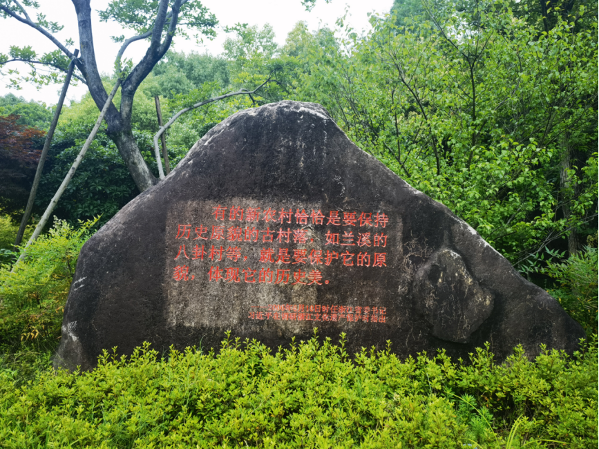 2004年8月10日,在人民日报《千村示范、万村整治一浙江省统筹城乡发展纪实》中,习近平总书记强调:“我省既有像兰溪的诸葛村、永嘉的芙蓉村、武义的郭洞村这样历史文化内涵丰富的古村落,又有像奉化的滕头村这样体现现代文明的新农村。”2006年6月10日,习近平总书记特别指出:“有的新农村恰恰是要保持历史原貌的古村落,如兰溪的八卦村等,就是要保护它的原貌,体现它的历史美。”如今这段话就矗立在八卦村的村口,为村落的建设与发展指明方向。在2016年全国文化产业工作会议上,习近平总书记再次肯定:“诸葛村人人都是文保员的保护模式就很好。”总书记的肯定与赞扬给予了诸葛八卦村人极大的鼓舞,诸葛八卦村人深刻领会总书记的讲话精神,完善各项保护制度、措施,完整保护好老祖宗留下的历史文化遗产。同时,将古村落旅游业和保护、改善村落人居环境紧密结合,发展壮大村集体经济,让它成为村民迈向共同富裕的“摇钱树”。