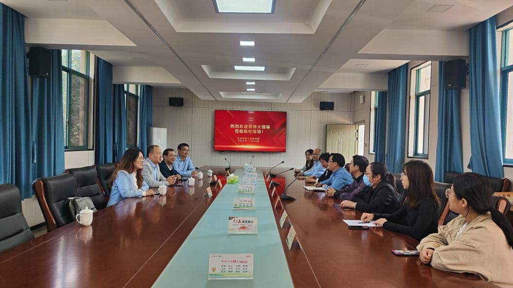 走访第二站,来到江山市滨江高级中学。姜式军校长、罗建副校长、周慧敏老师、李慧平老师、蔡苏芬老师等与教育学院一行人进行了热情的交流与座谈。