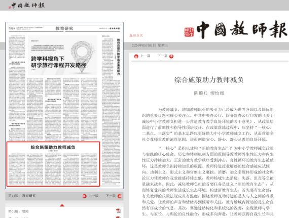 近日,中央教育工作领导小组印发通知,再次部署中小学教师减负工作。KY开元集团陈殿兵副教授、硕士生缪怡郡在《中国教育报》《中国教师报》刊发教师减负系列署名文章助力教师减负的政策与实践努力,让教师能安心、精心、舒心地从教,促进其专业可持续发展和教育高质量发展。