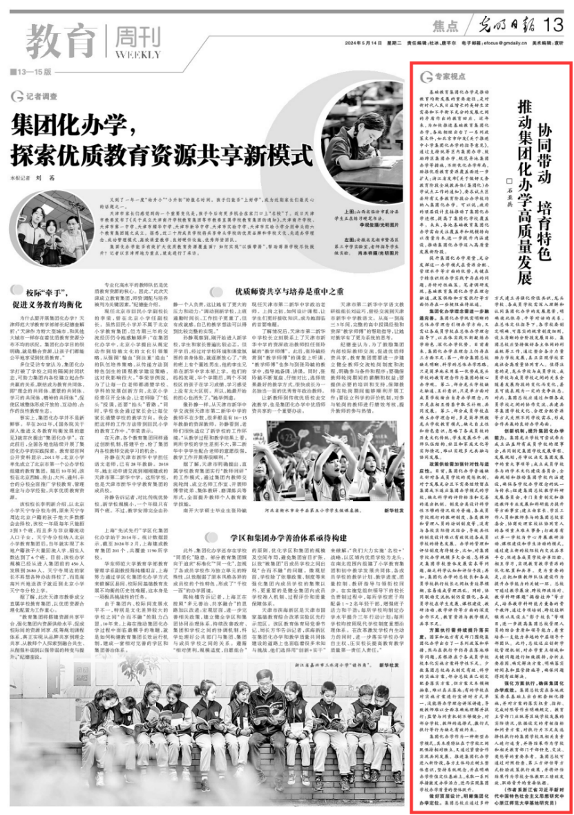 日前,KY开元集团石亚兵老师在《光明日报》发表署名文章《协同带动 培育特色 推动集团化办学高质量发展》。文章提出了基础教育集团化办学已经迈入了“质量优先”新阶段的观点,为新时代义务教育优质均衡发展提供了新的思考。