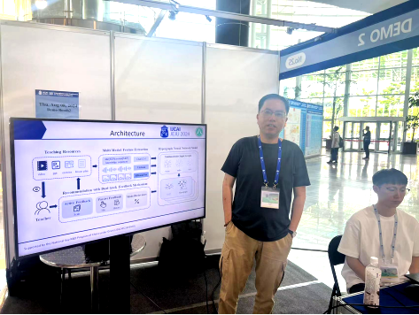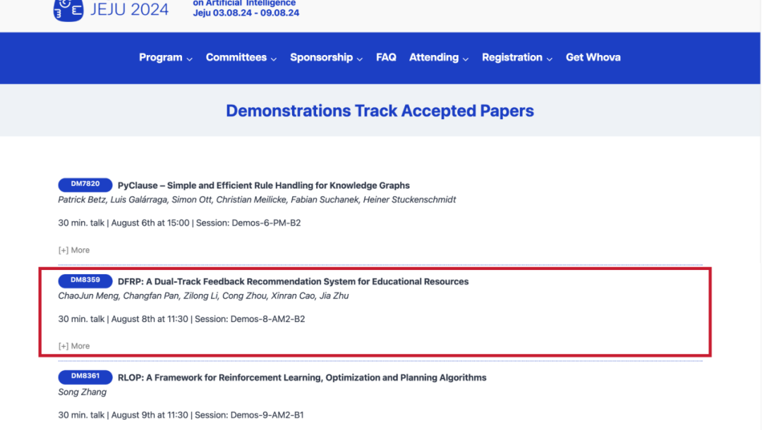 近日,我院朱佳教授团队研究成果“DFRP: A Dual-Track Feedback Recommendation System for Educational Resources”DEMO论文被“The 33rd International Joint Conference on Artificial Intelligence(IJCAI-2024)”正式接收,团队成员于8月6日在韩国济州岛专题会上汇报相关成果。会议上,团队研究引起了国内外学者的广泛关注,许多专家前来观摩并深入了解相关技术及应用。论文研究由硕士生蒙超俊等在朱佳教授指导下完成,由国家重点研发计划:农村地区教师教学能力智能评测与教学精准辅助技术研究(项目号:2022YFC3303600)支撑。