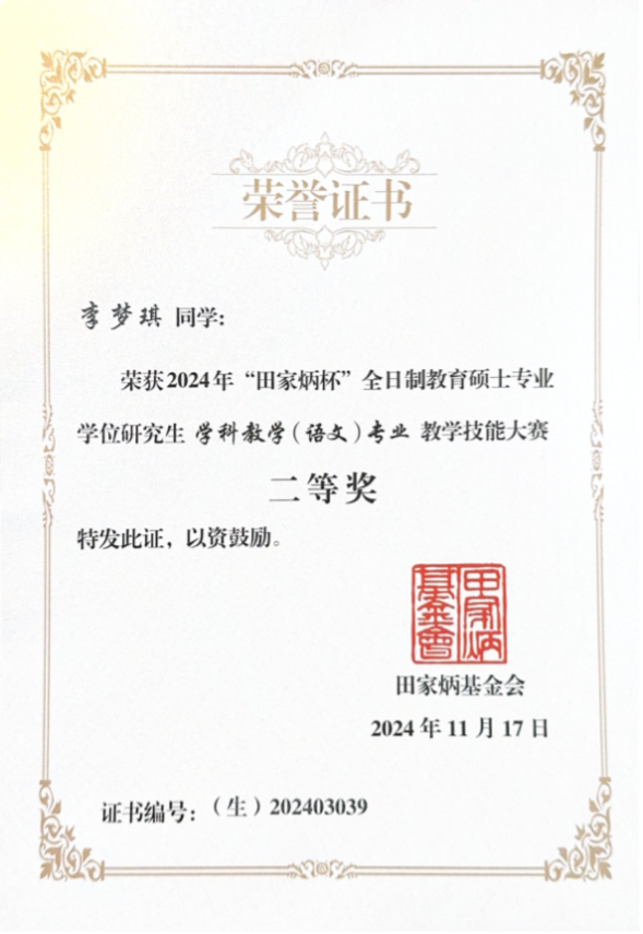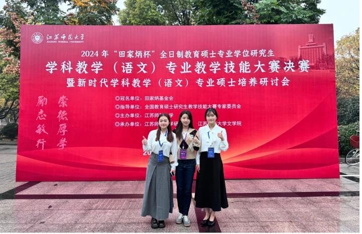 11月15-17日,2024年全国“田家炳杯”全日制教育硕士专业学位研究生学科教学(语文)专业教学技能大赛决赛在江苏师范大学举办,我院两名学生入围决赛,任睿老师带队参与,通过激烈的竞争,李梦琪获得二等奖,孔忆雯获得三等奖,俞向军老师获得优秀指导教师奖。
