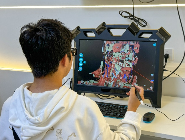 新型教学工具的展示环节,电子黑板可记录学生出勤情况,实时记录学生上课动态;纳米黑板书写便捷、清理简单,提供了六千余种颜色以供书写;3D眼镜能辅助学生更好地理解教学内容;激光笔操控 3D 立体模型转向,呈现每个零件的细节……