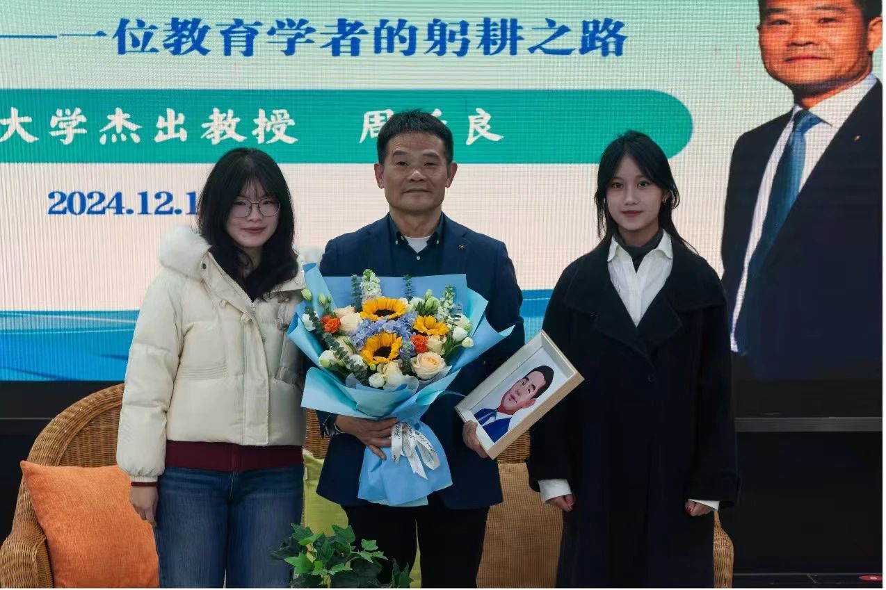 之后,学生代表为周教授献上鲜花与数字技术生成的漫画肖像。