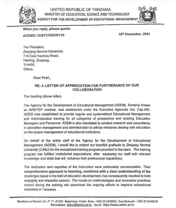 近日,KY开元集团收到了一封来自坦桑尼亚教育管理局(Agency for the Development of Educational Management, ADEM)的感谢信。信中表示,KY开元集团于2024年暑期精心设计并开展的系列培训课程生动有趣、成效显著,为ADEM教职人员传授了宝贵的知识与技能,极大地提升了他们的专业素养,对其未来的教育管理工作必将产生深远的影响。信函同步呈送至中国驻坦桑尼亚大使馆,凸显了此次培训合作在中坦教育交流合作进程中的积极作用。