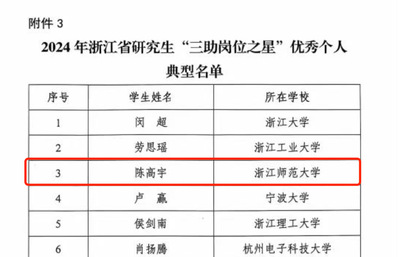 近日,浙江省学生资助管理中心办公室公布了2024年研究生“三助岗位之星”优秀个人典型名单,我院博士研究生陈高宇同学成功入选(全校唯一获奖)。