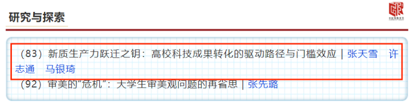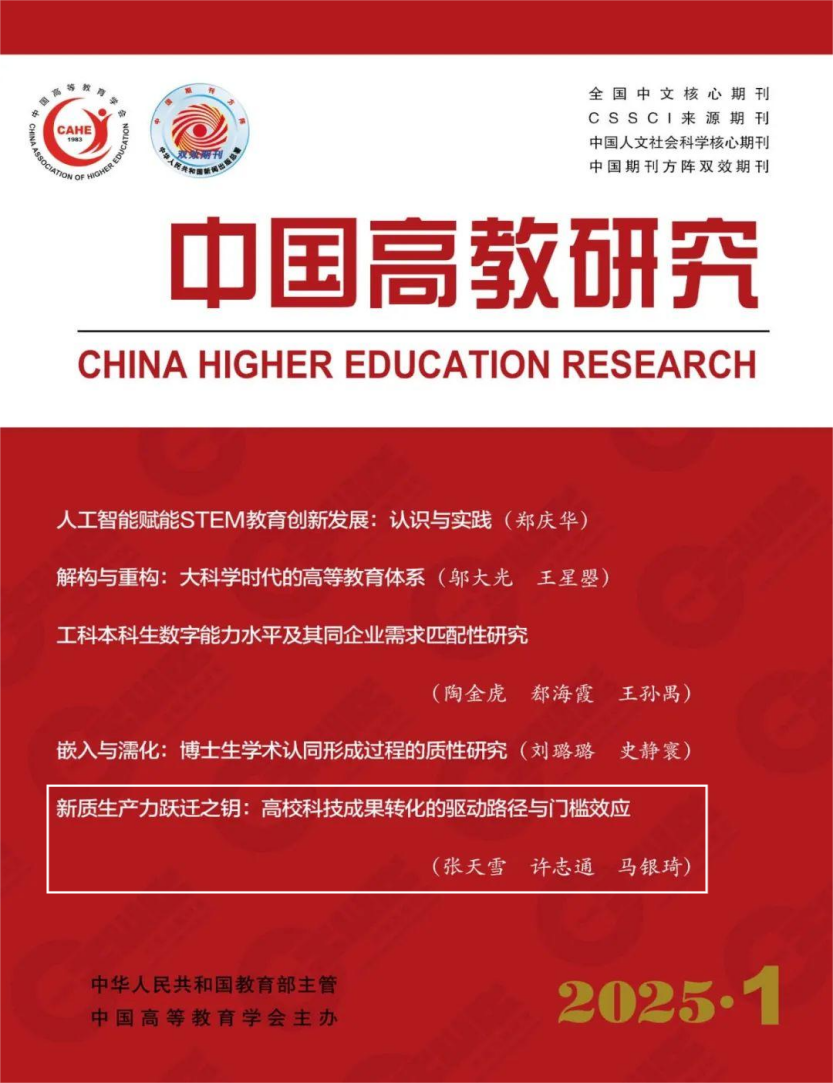 近日,浙江师范大学教育改革与发展研究院常务副院长张天雪教授、硕士研究生许志通以及青年教师马银琦在CSSCI来源期刊《中国高教研究》2025年第1期发表文章《新质生产力跃迁之钥:高校科技成果转化的驱动路径与门槛效应》。