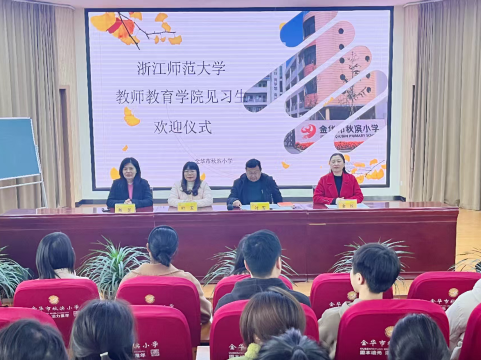 见习欢迎仪式在秋滨小学报告厅举行。秋滨小学党委书记、校长叶军,详细介绍了学校的教学特色、教育理念和校园基本情况。叶军强调,学校秉持学生全面发展与教师专业成长的双重视角,系统性打造“银杏三梯两群落”校本研训体系,同时依托“名校结对”等项目持续推进教师发展共同体建设,通过分层培养机制与跨校协作模式实现教师队伍素养的阶梯式提升,这让同学们对未来的实践环境有了更清晰的认识。随后,副校长金姣介绍了见习工作的具体安排,并对大家提出了殷切期望。希望同学们积极主动向导师学习,多听课、多反思,努力提升教学能力;同时也希望导师们认真指导,助力同学们成长。