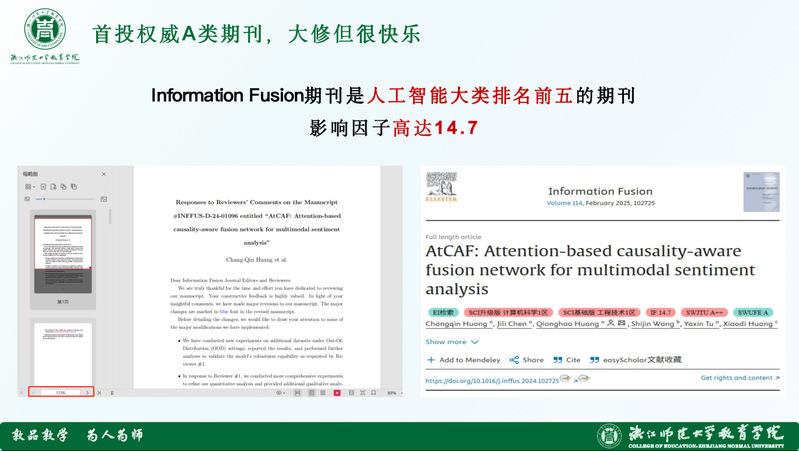 在学术成果方面,陈继力成绩卓著。他以应用为导向开展研究,已发表智能教育相关期刊和会议论文共 6 篇,涵盖权威 A 类、权威 B 类、一级期刊、EI 会议,累计影响因子超 32。首次冲击权威 A 类期刊时,面对审稿人的 15 条意见,他熬几个“大夜”撰写长达 36 页的回复信,最终文章成功发表在人工智能大类排名前五、影响因子高达 14.7 的期刊上。目前,他还有两篇多模态教学情感分析工作正在投稿,一篇投稿至多媒体技术领域全球第一期刊多模态顶刊 TMM,另一篇 CCF-B 类期刊已进入一审小修,并获评 “最佳论文候选”,每年仅有一篇文章能获此殊荣。此外,他还参与或主持国家级、省级、校级课题 5 项,受理和授权国家发明专利各 1 件,荣获国家奖学金、校优秀毕业生推荐资格、校一等奖学金等数十项荣誉。