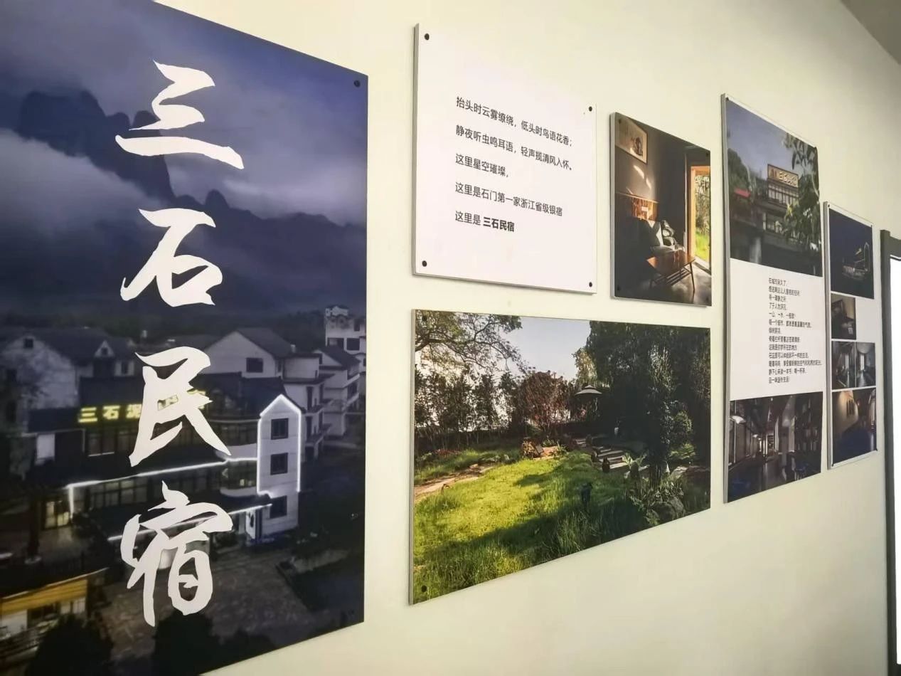随后,实践队员们在周忠亮的带领下重点参观了江郎山村展馆与江郎山丹霞奇观。无论是枕山而居的“三石”民宿,还是宾至如归的“如归”农家乐,江郎山村民凭借得天独厚的胜景,实现了景美民富的振兴愿景。其中,“三石”民宿作为江郎山村的亮眼名片,依托山麓绝佳观景区位,匠心打造花园餐厅、观景平台等网红打卡点,令住客充分感受何为“天地为庐,造化共居”。