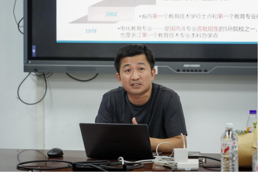 教育技术系主任王小明介绍了该系依托国家级实验教学示范中心和省级重点实验室所取得的突破。他在讲话中重点强调了学科建设所取得的成就,尤其是荣获八大“国”字号荣誉,引起了全场阵阵掌声。