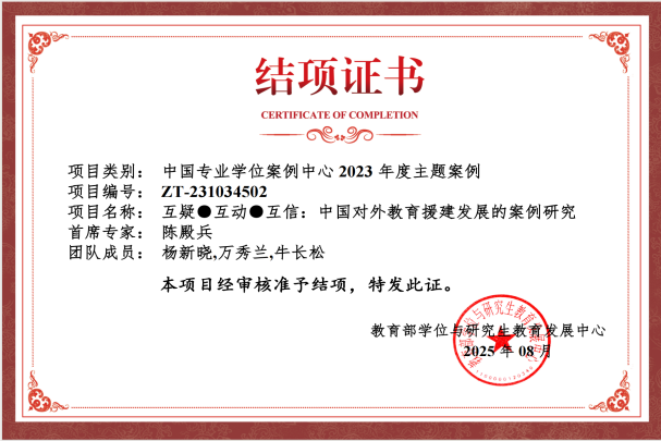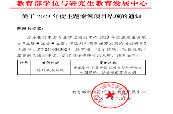 近日,教育部学位与研究生教育发展中心公布了2023年主题案例项目结项通知,kaiyun开云官方网页版陈殿兵老师主持的,杨新晓、万秀兰和牛长松老师参与的《互疑·互动·互信:中国对外教育援建发展的案例研究》顺利结项,案例《战乱影响下非洲国家教育规划研制的中国经验:以援建南苏丹为例》通过专家评议,后续按程序收录入库。