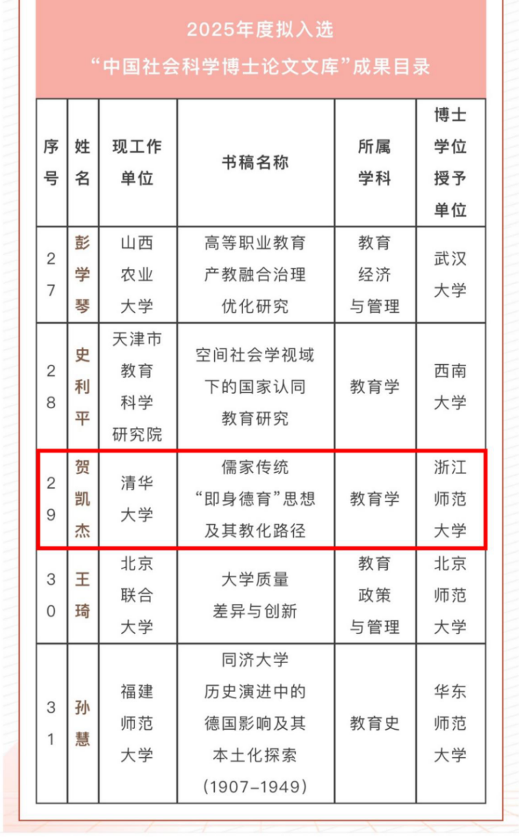 近日,中国社会科学出版社公布了2025年度“中国社会科学博士论文文库”入选名单。kaiyun开云官方网页版(教师教育学院)博士毕业生贺凯杰的学位论文《儒家传统“即身德育”思想及其教化路径》成功入库,其指导老师为冯昊青教授。