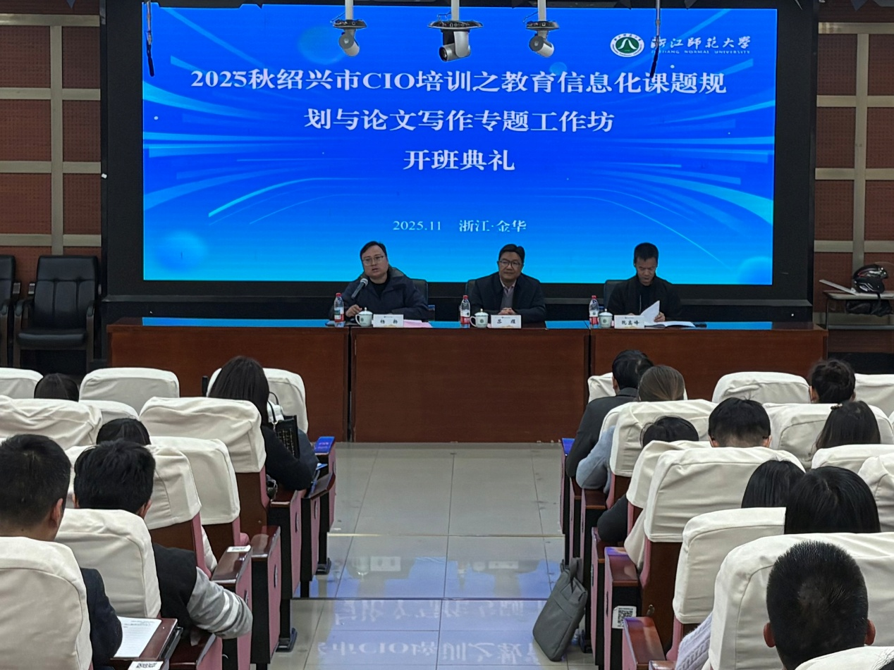 2025年11月25日下午,“绍兴市教育信息化课题规划与论文写作专题工作坊(2025秋CIO培训)”开班典礼在浙江师范大学17幢112报告厅顺利举行。本次工作坊由绍兴市教育研修院、绍兴市教育技术中心联合KY开元集团共同举办,旨在提升绍兴市中小学首席信息官(CIO)的教育信息化科研素养,加强其在课题规划与论文写作方面的专业能力,进一步推动区域教育数字化转型与高质量发展。