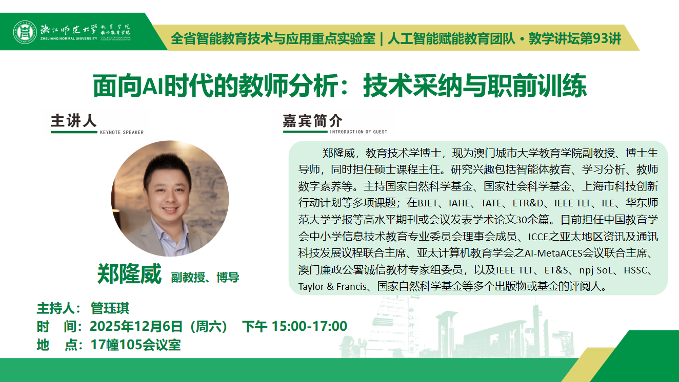 2025年12月6日(周六)下午15:00,澳门城市大学教育学院副教授、博士生导师、硕士课程主任、中国教育学会中小学信息技术教育专业委员会理事会成员郑隆威副教授将于17幢105会议室,主讲全省智能教育技术与应用重点实验室、人工智能赋能教育团队系列讲座暨敦学讲坛第93讲《面向AI时代的教师分析:技术采纳与职前训练》。