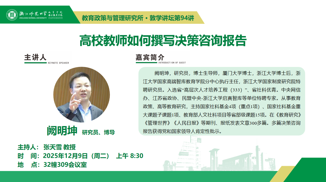 2025年12月9日(周二)上午8:30,浙江大学国家制度研究院特聘研究员、博士生导师、浙江大学国家高端智库教育学院分中心执行主任,中央网信办、江苏省政协、民盟中央-浙江大学启真智库等单位特聘专家阙明坤研究员将于32幢309会议室,主讲教育政策与管理研究所系列讲座暨敦学讲坛第94讲《高校教师如何撰写决策咨询报告》。主持人为张天雪教授。