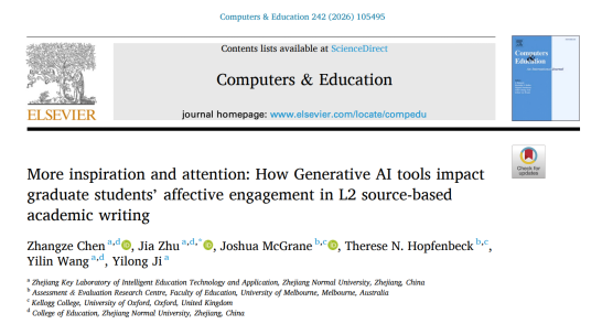 朱佳教授团队与墨尔本大学学者合作发表成果“More inspiration and attention: How Generative AI tools impact graduate students’affective engagement in L2 source-based academic writing”,发表于教育技术顶刊《Computers & Education》。研究采用随机对照实验(RCT),从问卷与屏幕回放刺激回忆、半结构访谈等多源数据评估学习者在不同写作阶段的情感投入变化。