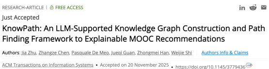 朱佳教授团队与香港科技大学、意大利墨西拿大学等单位的学者合作发表论文 “KnowPath: An LLM-Supported Knowledge Graph Construction and Path Finding Framework to Explainable MOOC Recommendations”,发表于CCF A类期刊《ACM Transactions on Information Systems(TOIS)》。论文面向MOOC海量课程带来的“信息过载”和“推荐可解释性不足”等问题,提出KnowPath推荐框架:利用开源大语言模型构建能够刻画学习者、课程、教师与资源等多实体关系的知识图谱,并结合强化学习在图谱中寻找可解释路径,以生成更透明的推荐依据。