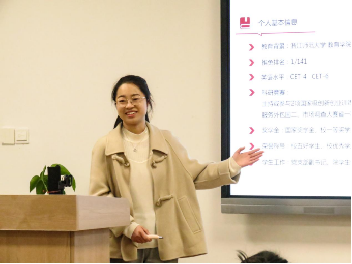 吴可(教育技术学2020级,保研至现代教育技术专业,现为我院2025级研究生)围绕“支教保研”主题,详细解读了相关政策要求、招募对象与选拔条件。她特别指出,自我介绍的核心在于真诚表达支教初心,并彰显个人特质与岗位的匹配度。她结合亲身经历感悟道:“支教保研既需要扎实的学术功底,更需要一颗热爱教育、服务社会的赤诚之心。”