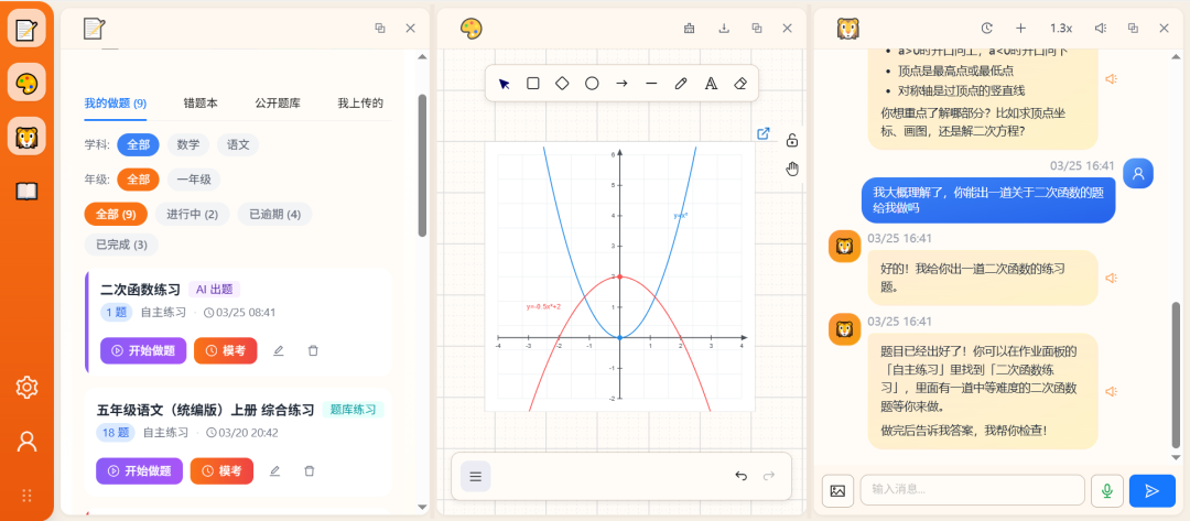 “浙小狮”作为一款学生作业答疑智能白板交互系统,通过整合作业练习区、白板交互区、大语言模型答疑区及教材资源区四大核心模块,能够精准捕捉并高效响应学生的学习需求。该系统旨在突破传统大语言模型仅基于文字交互的局限,创新实现大语言模型与交互式白板的深度融合,除常规文本对话外,更支持多模态双向交流。学生可通过在白板上写字、绘画等直观方式与大模型实时互动。针对仅靠文字对话难以阐释的抽象概念或复杂问题,大模型还能在白板上生成可视化演示内容,让答疑更直观、交流更高效。该系统打破了传统答疑模式的时空限制与形式壁垒,将抽象知识具象化、复杂问题简单化,有效降低了学生自主学习的门槛。同时,它充分贴合学生的学习习惯与认知特点,激发学生的探究兴趣与学习主动性,培养其独立思考、自主解决问题的能力,最终助力学生实现个性化、高效化学习。