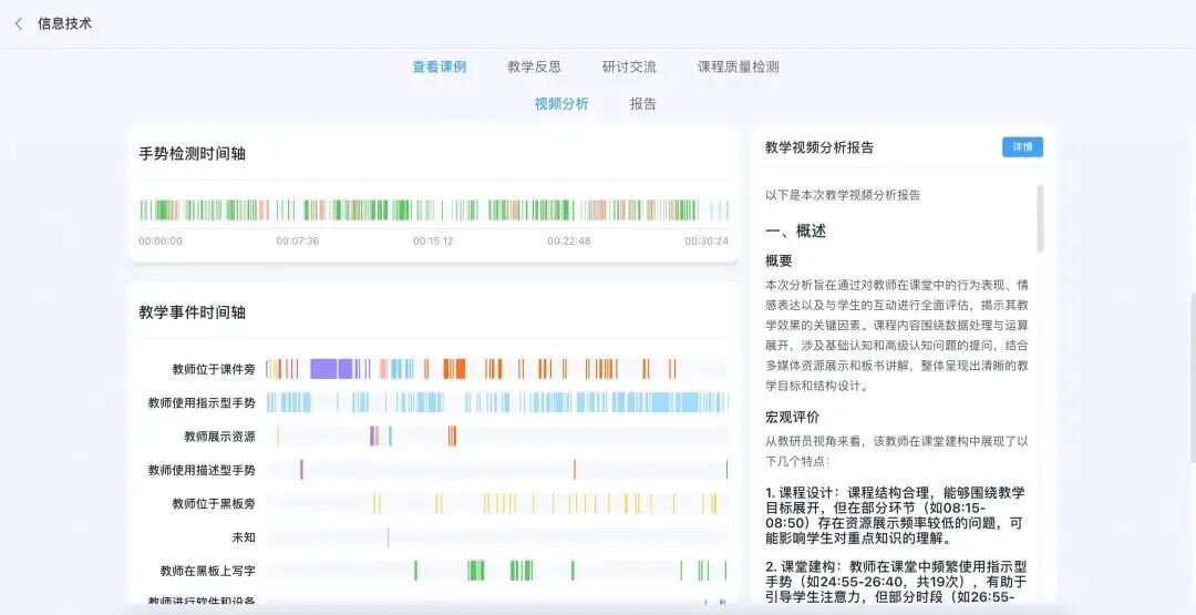 “师道”是一款聚焦教师专业发展的智能平台。该平台整合了资源中心、备课中心、检课中心三大核心模块,全方位覆盖教师教研、备课、评课全流程,为教师专业成长提供精准赋能与高效支撑。备课中心依托无限延伸的智能白板空间、丰富多元的教学工具及智能AI助手,不仅能助力教师高效完成教学设计、课件制作等备课工作,更能打破空间壁垒,支撑教学团队开展跨场景、高效率的专业协作备课,凝聚教研合力。检课中心则通过先进的AI技术对教师授课视频进行全方位诊断分析,精准捕捉教师的语音情感、教学事件、教学手势等关键教学维度。它能生成针对性强、数据详实的教学视频分析报告,为教师精准定位教学优势与改进方向提供科学的数据支撑,真正实现以数据为依据、以改进为目标的循证教研,助力教师持续提升教学质量。