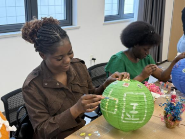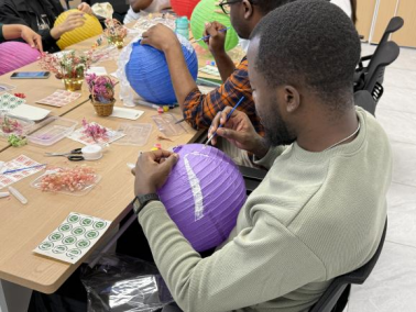 花绕灯,灯映花。国际学生们围坐案前,以画笔为媒、花艺为语,将本国文化元素与校庆主题巧妙融合——有人以灯笼为纸,绘就本国国旗图腾的斑斓;有人用彩带穿针,编织对学校美好的祝愿;还有人将校徽、校庆贴纸点染其间,让中式灯笼的温润与异国风情的热烈相映成趣。
